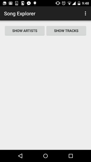 In version 2 of the Song Explorer app, we add a new table called tracks and populate it with some data. Since we are changing the database schema, we have to change the database version number and implement the onUpgrade method accordingly. Now, pressing the Show Tracks button displays a list of tracks.