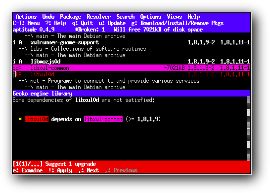 aptitude can either be used as a command line tool or as a text application (see picture above). In both cases, aptitude can then: